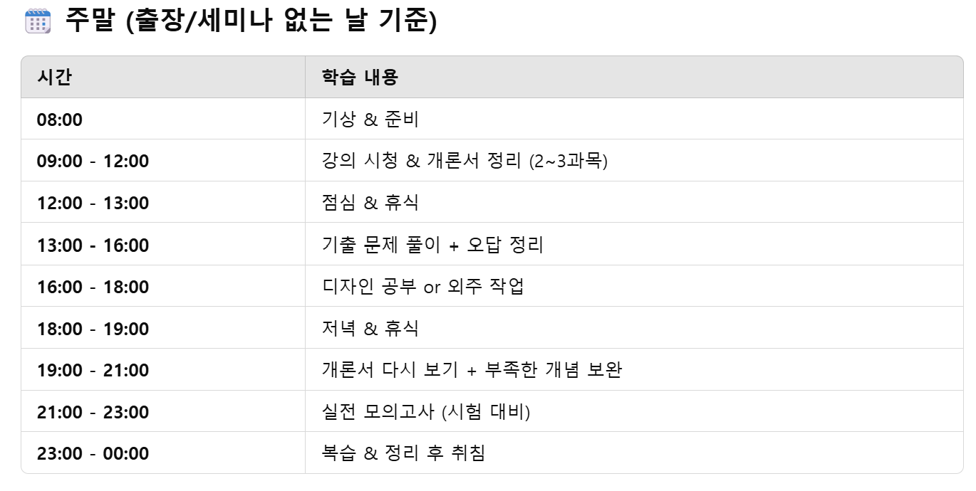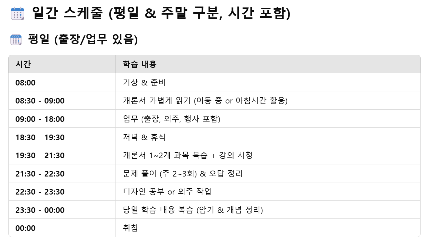 나의 경우 프리랜서 디자이너로 일을 하고 있었고, 포트폴리오를 꾸준히 업데이트 해야 했었기 때문에 하루종일 공부만 할 수는 없는 상황이었다. 이런 상황들을 다 고려해서 스케쥴을 1차로 뽑았다. 아래는 실제로 내가 시험을 준비하면서 썼던 챗지피티로 생성한 시험대비 스케쥴표다.
